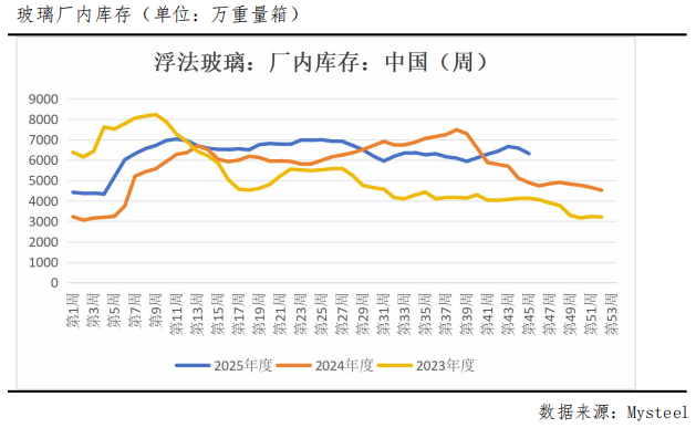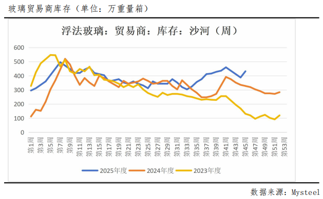 库存是衡量市场供需平衡状况的核心观测指标,其变动趋势备受关注。Mysteel最新统计数据显示,截至11月7日,全国浮法玻璃企业厂内库存为6313.6万重量箱,环比下降265.4万重量箱,降幅4.03%,但同比仍高出1421.4万重量箱,增幅达29.05%。同期,沙河地区贸易商库存为432万重量箱,环比增加44万重量箱,增幅11.34%,同比亦增长104万重量箱,增幅31.71%。从库存结构来看,尽管厂内库存出现一定去化,但其主要源于库存由生产端向贸易环节的转移,而非被终端实际消化。整体来看,当前库存水平仍显著高于历史同期,处于绝对高位,行业高库存压力尚未得到实质性缓解。
