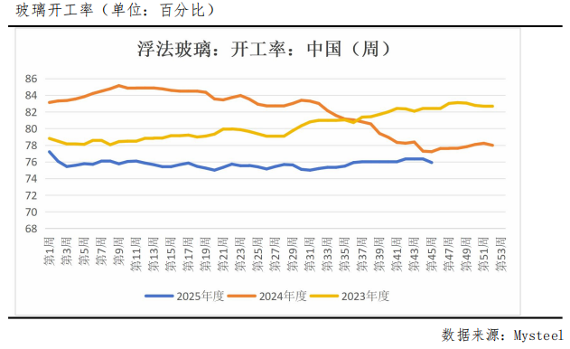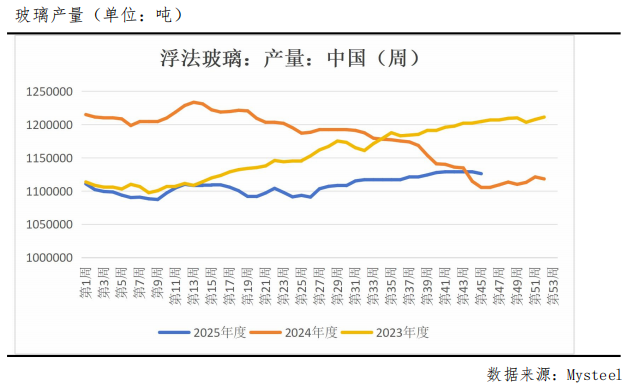自7月起,玻璃行业开工率与产量呈现持续上行趋势,供应压力逐步累积,成为压制玻璃价格的重要因素之一。据Mysteel最新统计数据显示,截至11月7日当周,浮法玻璃开工率为75.92%,环比下降0.43个百分点,同比下降2.7个百分点;同期浮法玻璃产量为112.61万吨,环比下降2840吨,降幅0.25%,但同比仍增加20660吨,增幅1.87%。数据表明,尽管短期供应出现边际收缩,但整体仍高于去年同期水平,行业供给仍处于同比扩张区间。