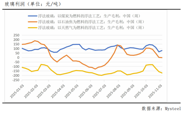 据Mysteel最新统计数据显示,截至11月7日当周,不同燃料类型的浮法玻璃生产工艺盈利情况呈现明显分化。其中,煤炭为燃料的浮法工艺生产毛利为78.1元/吨,环比上升14.65元/吨,仍保持盈利状态;而以石油焦为燃料的工艺毛利为-1.77元/吨,环比下降2.86元/吨,已处于盈亏平衡线附近;天然气为燃料的工艺毛利为-172.7元/吨,环比进一步下滑15元/吨,处于深度亏损区间。从整体来看,浮法玻璃行业平均利润为-32元/吨,除煤制工艺尚存微薄利润外,其余两种工艺均呈亏损状态,尤其天然气工艺亏损程度最为严重。利润持续承压已促使部分企业安排冷修,若玻璃价格继续走弱,后续行业停产检修规模可能进一步扩大。