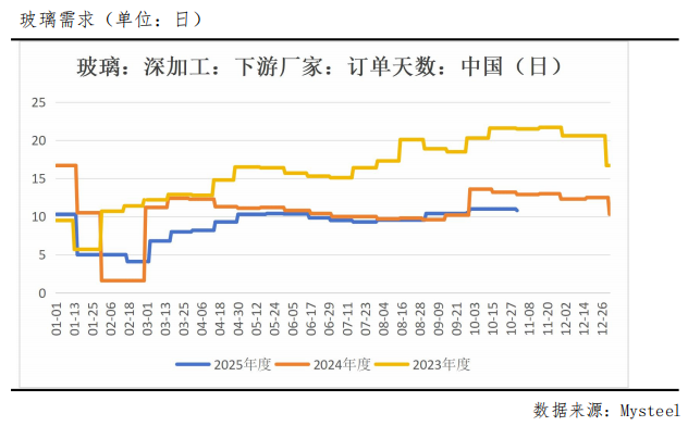 房地产及其相关的建筑行业作为平板玻璃的核心需求领域,其持续低迷对玻璃消费形成了显著制约。需求疲软在订单数据上得到进一步印证:10月期间,玻璃深加工企业订单天数普遍维持在11天左右,较去年同期的13天左右明显收缩。据Mysteel最新统计数据显示,截至10月31日,深加工企业订单天数为10.8天,环比下降0.2天,同比亦减少2.1天。该数据不仅反映当前整体产销表现偏弱,也显示出厂家对后续市场需求预期较为谨慎,信心有待提振。