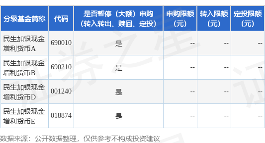 注:(1)根据法律法规和基金合同的规定,民生加银基金管理有限公司(以下简称“本公司”)决定自2025年11月27日起,调整本基金非个人投资者在代销机构的大额申购、大额转换转入、大额定期定额投资业务限额,即非个人投资者单日单个基金账户在代销机构累计申购(含转换转入、定期定额申购,下同)本基金的金额不应超过100,000元。如非个人投资者单日单个基金账户在代销机构单笔申购本基金的金额超过100,000元(不含),则100,000元确认申购成功,其余部分本公司有权部分或全部拒绝;如非个人投资者单日单个基金账户在代销机构多笔累计申购本基金的金额超过100,000元(不含),则对该基金的申请按照申请金额从大到小排序,本公司将逐笔累加至不超过100,000元限额的申请确认成功,其余交易申请本公司有权部分或全部拒绝。(2)上述规则针对本基金A类、B类、D类、E类份额合并计算进行限制。(3)对于非个人投资者通过直销机构办理本基金申购、转换转入、定期定额投资业务的,不受此次限制金额调整的影响,继续执行本公司于2024年11月26日发布的《民生加银现金增利货币市场基金调整大额申购、大额转换转入、大额定期定额投资业务限额的公告》中大额申购、大额转换转入、大额定期定额投资的限制性规定;对于个人投资者办理本基金申购、转换转入、定期定额投资业务的,不受此次限制金额调整的影响,继续执行本公司于2025年10月17日发布的《民生加银现金增利货币市场基金调整个人投资者大额申购、大额转换转入、大额定期定额投资业务限额的公告》中大额申购、大额转换转入、大额定期定额投资的限制性规定。(4)本基金限制上述相关业务期间,正常办理本基金的赎回和转换转出等业务。本基金恢复办理大额申购、大额转换转入、大额定期定额投资业务的具体时间将另行公告。