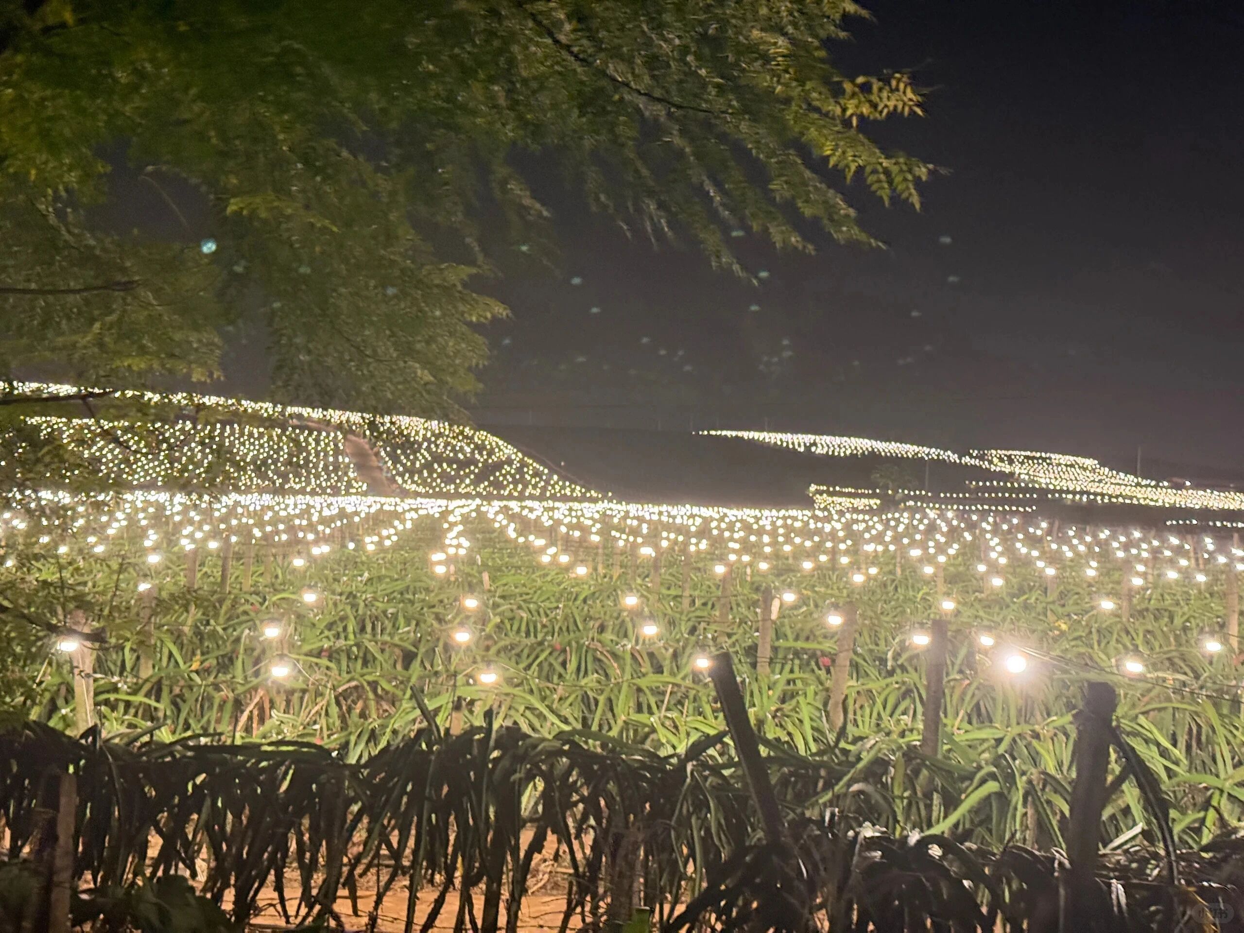 火龙果种植园定期开始上演的大型灯光秀,是为了让火龙果“不睡觉”,促进生产,从而让我们能在更多时段吃到美味营养的火龙果。